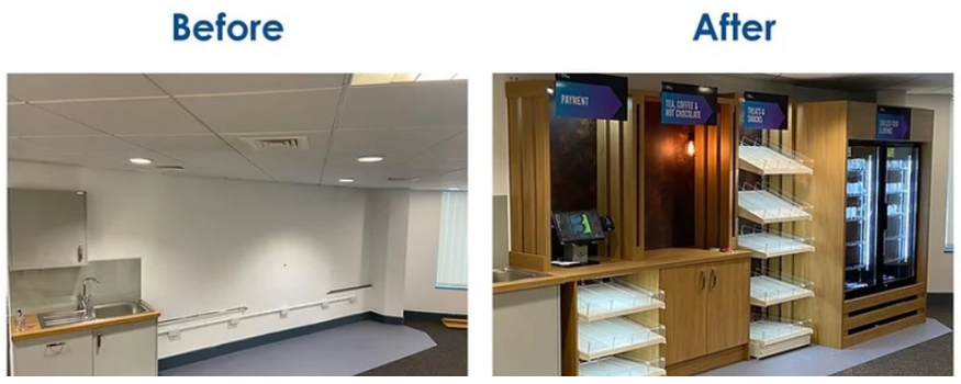 An empty breakroom with limited options. Employees had to leave the building for meals, losing time and focus.